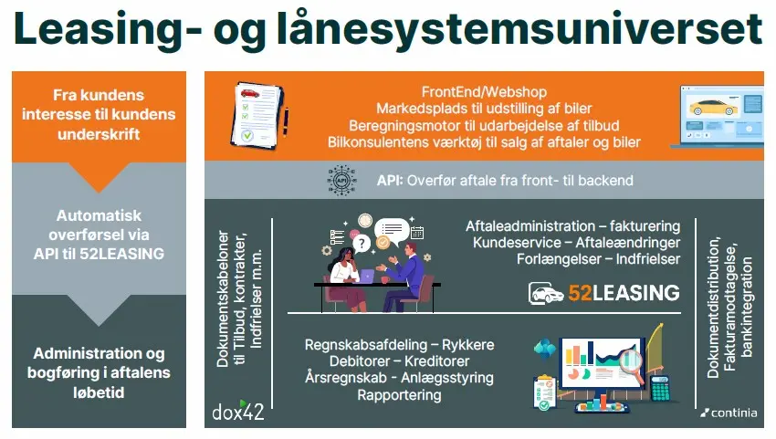 Der findes desuden allerede frontendleverandører, som har færdige integrationer til 52LEASING. Ønskes en mere færdig og samlet løsning, kan dette derfor også leveres gennem etablerede samarbejder.